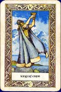 With his cloak blowing in the wind,the king holds a chalice high in offering to the sea.